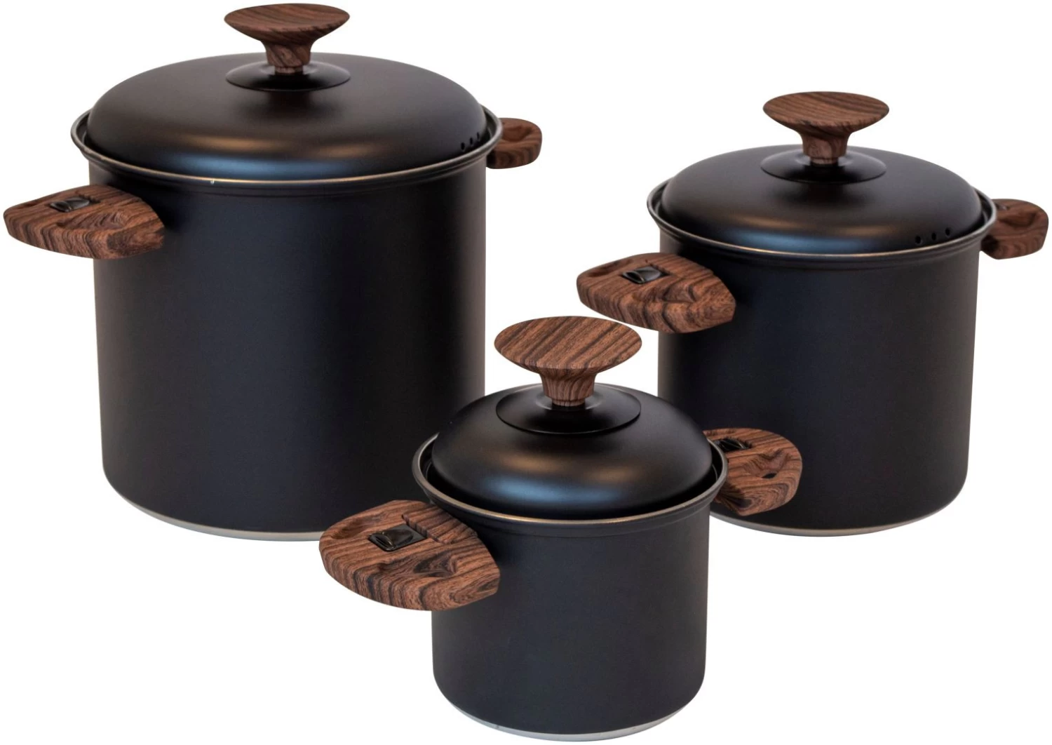 An industrial 3-part stainless steel pan set. Every pan has a glass lid with heat-resistant knob. The pans have an industrial look because of black stainless steel and the woodlook buttons. In addition, every pan has heat-resistant and retractable hand grips. These hand grips can be easily folded after use so that the pans are fully nestable and compact to store.