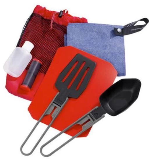 This lightweight, basic kitchen set includes all your favorite utensils and accessories wrapped in one convenient package.INCLUDES Folding Spoon, Spatula, Ultralight Cutting Board, Salt & Pepper Shaker, Squeeze Bottle and Dish Towel.