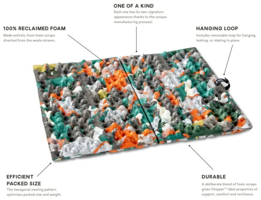 More than just a lightweight and easily packed seat cushion, Chipperâą is also a big step in sustainable manufacturing. Made entirely from reclaimed and remolded PE foam scraps from our sleeping pad production, weâre reducing our footprint and making a fun, unique, and extremely resilient product.