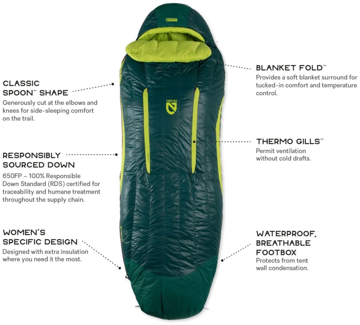 Ces sacs à dos 3 saisons sont dotés de caractéristiques telles que Thermo Gills™ qui aident à réguler la température pendant la nuit, Blanket Fold™ qui offre un confort intégré et une boîte imperméable/respirante pour résister à la condensation sous la tente. Les fermetures éclair sur le côté gauche pour homme et sur le côté droit pour femme permettent à Disco™ de se fermer pour une version double de ces sacs de couchage préférés.