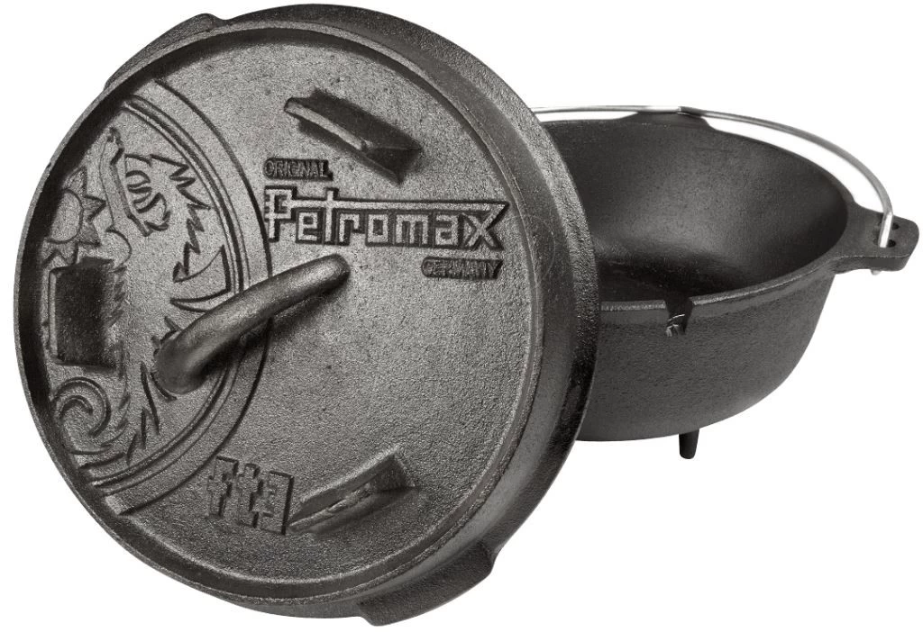 Een traditionele en multifunctionele gietijzeren pan. Deze Dutch Oven is uitermate geschikt voor het bereiden van maaltijden boven open vuur of op hete kolen. Het massieve gietijzer verdeelt de warmte zodat de pan zonder problemen kan worden gebruikt om te bakken, braden, frituren, koken of stoven. De pan is voorzien van een ‘pre-seasoned’ coating tegen aanbakken en roesten. Kan tevens worden gebruikt als oven door gloeiende houtskoolbriketten op het deksel en om de pan te plaatsen. Het deksel is voorzien van 3 kleine pootjes en een opstaande rand. Zo kan het deksel tevens worden gebruikt als koekenpan, hapjespan of als schaal. Aan de onderkant bevinden zich eveneens 3 pootjes zodat de pan stabiel in het vuur kan worden geplaatst. Voorzien van een kleine opening voor gebruik van een thermometer en een hengsel om de pan op te hangen aan de Cooking driepoot. Afmetingen (Øxh): 25×16 cm. Inhoud: 2,3 Liter.