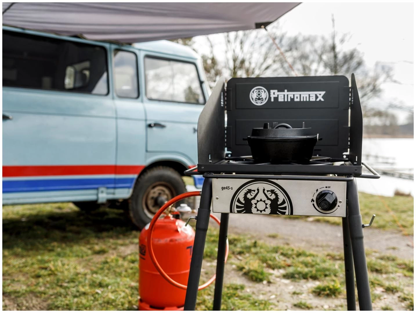 Le poêle à gaz à double brûleur Petromax est un poêle autoportant robuste et stable à 1 brûleur. Que vous voyagiez ensemble, que vous cuisiniez en groupe ou en famille, grâce au puissant poêle à gaz de 5 kW, vous pouvez facilement préparer un délicieux repas sur place. Comme vous êtes habitué à de Petromax, cette table de cuisson est très robuste. La table peut être chargée jusqu’à 80 kg, de sorte que même votre poêle en fonte ou votre four néerlandais peut être utilisé sans aucun problème. La cuisinière est également équipée d’une protection contre le soufflage : lorsque la flamme s’éteint, l’alimentation en gaz est automatiquement coupée.
