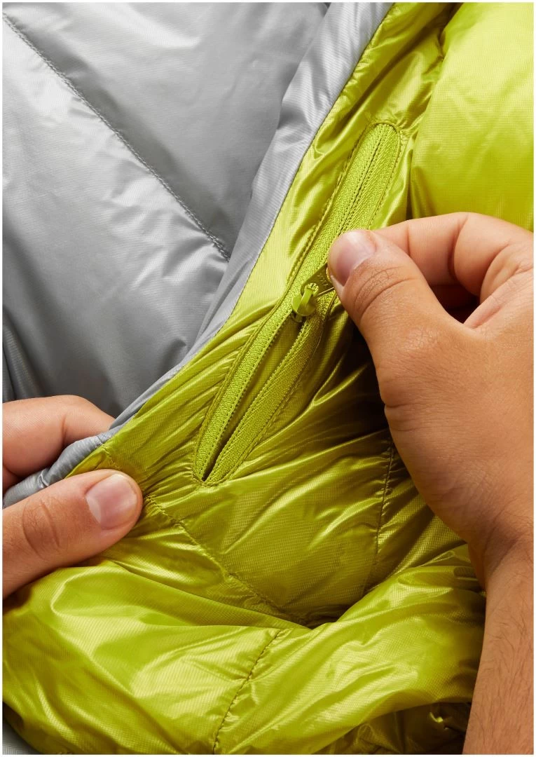 The chevron style baffle design keeps the down in position, optimising core warmth and reducing the amount of fabric needed compared to traditional horizontal baffles. The outer is made from our own wind and water-resistant, Atmosâą fabric. At just 7D with a built-in ripstop, itâs both ultra-light and super tough. It has a narrow mummy shape to minimise bulk, lightweight zips and pullers, and comes with a lightweight, waterproof, roll top compression sack for protection from the elements and a small pack size while on the move. The trapezoid boxwall baffle construction allows the down to fully loft, eliminates cold spots, and maximises warmth. It has an additional, adjustable baffle around the neck and an internal baffle along the length of the zip, both designed stop the heat from escaping. Hand-filled in the UK, all our down bags benefit from never having had their down compressed before use, maintaining the downâs loft and warmth.