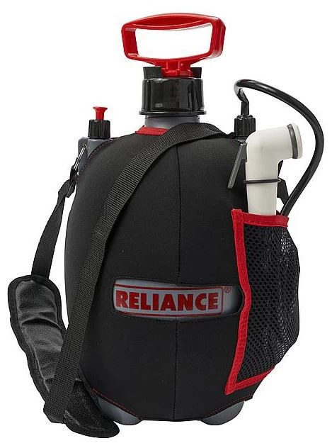 A portable pressurized shower. Equipped with an articulated hose and pressure relief valve. With a capacity of 8 liters and equipped with a nozzle. In addition, easy to carry on the supplied carrying strap. After use, the shower can be refilled.