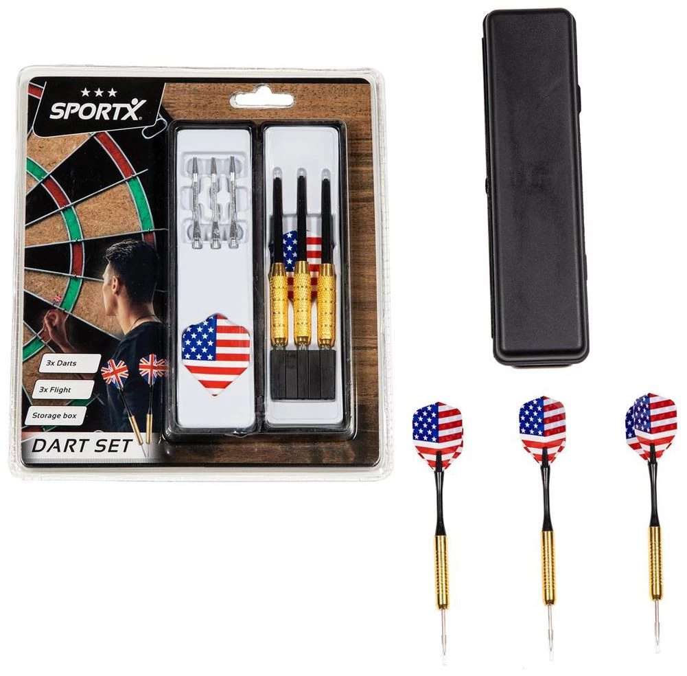 SportX Dart set in case. Inhoud: 3 x steeltip brass darts en 3 flights. Wordt geleverd in handige opbergbox, in full-colour clamshell.