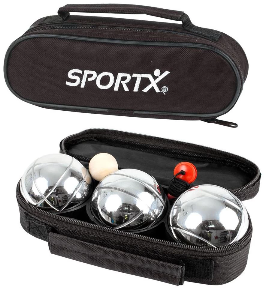 Set van drie SportX jeu de boules ballen. Met houten balletje en meetkoord. Ideaal om mee te nemen. Wordt geleverd in stevige tas met SportX-borduring.